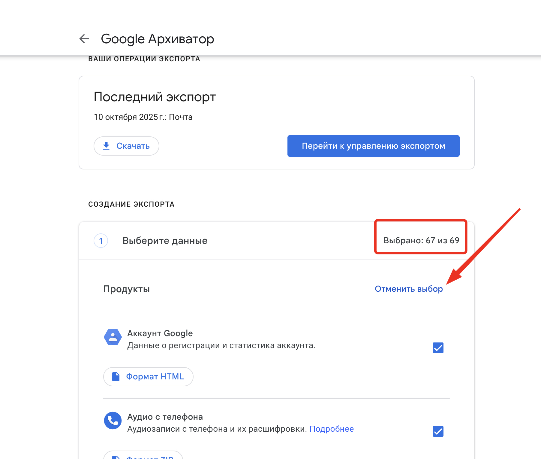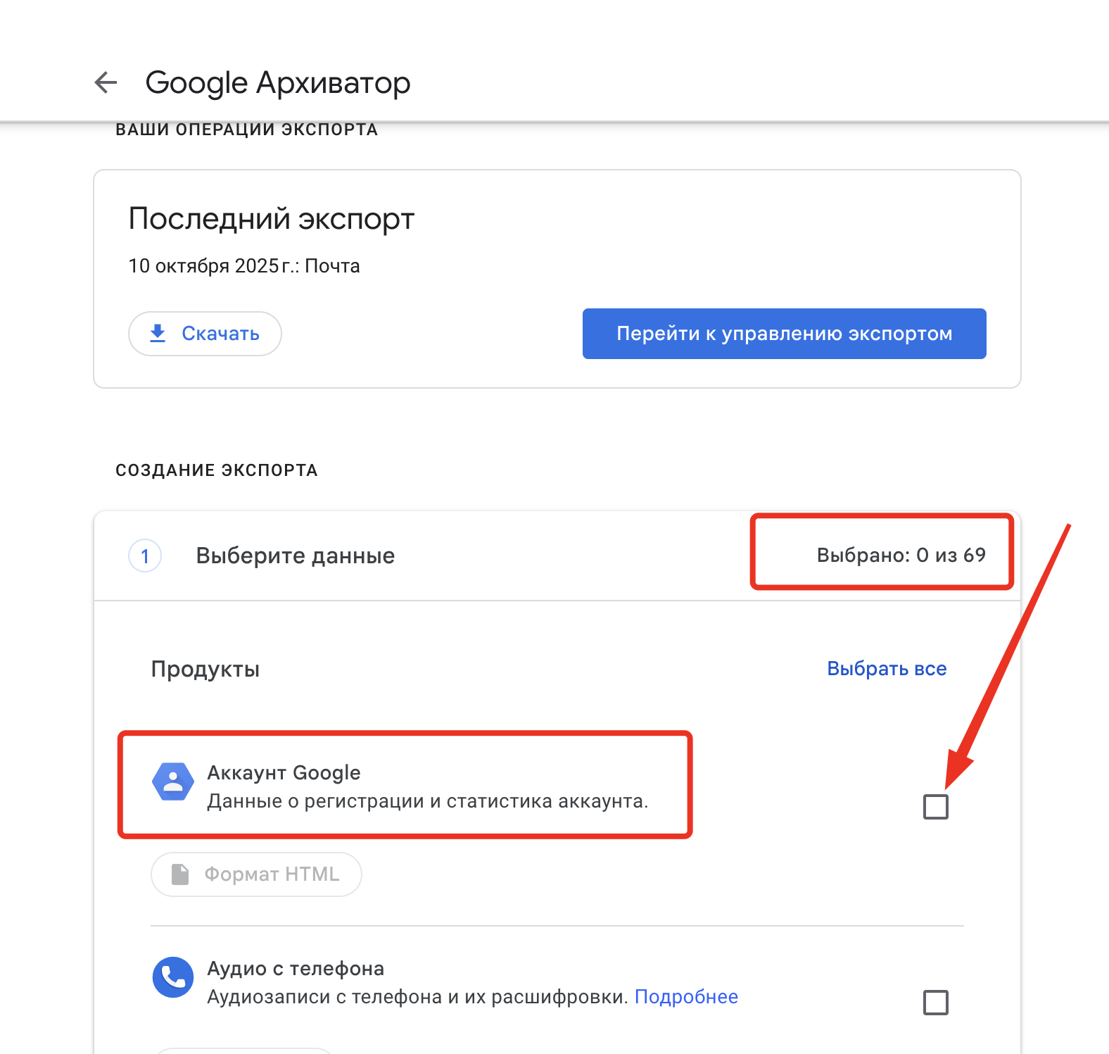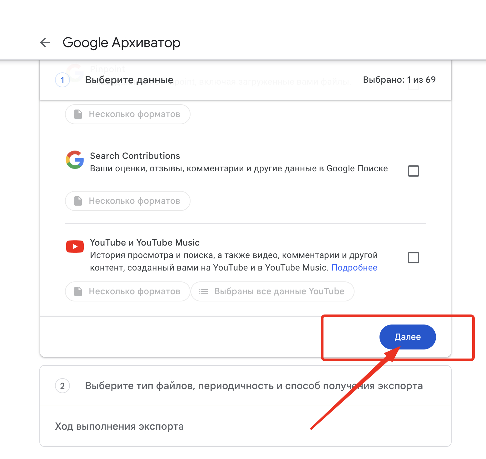 Шаг 1. Для этого Вам необходимо войти в аккаунт google для которого хотим узнать данные, и перейти по этой ссылке takeout.google.com