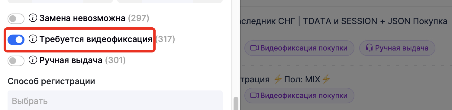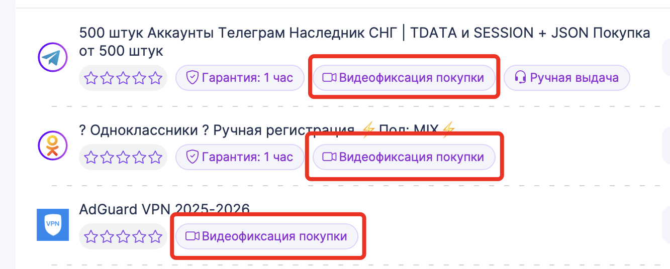 Обратите внимание! Не весь товар на нашем маркетплейсе должен сопроваждаться видеозаписью покупки и дальнейшей проверки товара. Товар требующий видеофиксацию, имеет атрибут "Видеофиксация покупки". У Вас есть возможность воспользоваться фильтром, и "отсеить" аккаунты которые требуют видеофиксацию.