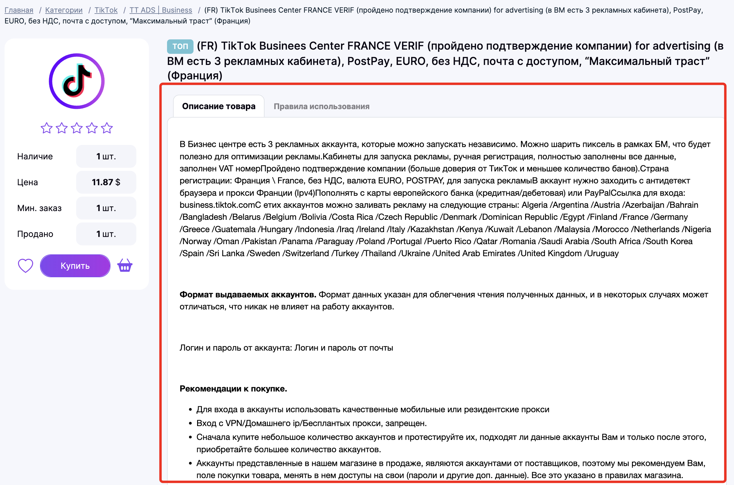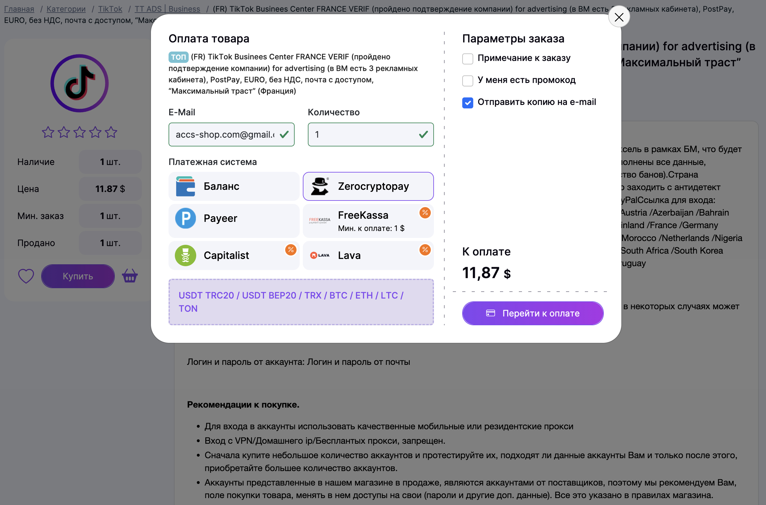 4. После того как вы ознакомились с описанием, и вам подходит выбранный товар, необходимо нажать на кнопку "Купить". Заполнить необходимые поля. Ввести рабочую почту, к которой у вас есть доступ. Указать нужное кол-во аккаунтов. Выбрать нужный вам способ оплаты, после чего нажать кнопку "Перейти к оплате"
